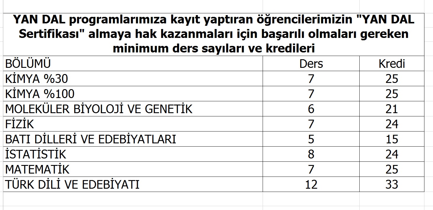 Kimya Bölümünde YAN DAL yapabilecek programlar (19.09.2022/06 tarih ve sayılı YTÜ Senatosu)