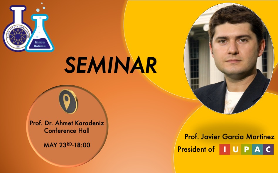 IUPAC (International Union of Pure and Applied Chemistry) Başkanı Sn. Prof. Javier García-Martínez 23 Mayıs 2022 Pazartesi günü saat 18:00'de Prof. Dr. Ahmet Karadeniz Konferans Salonunda bir Seminer verecektir. Siz değerli hocalarımızın, lisans ve LÜ öğrencilerimizin katılımı hususunda bilgilerine sunarız.