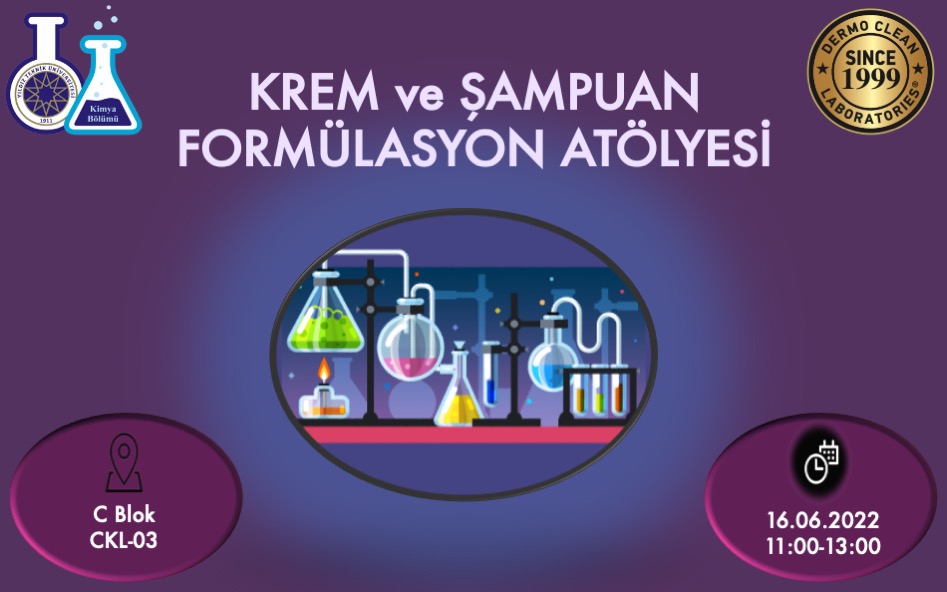 16.06.2022 tarihinde saat: 11:00-13:00 saatleri arasında C-Blok CKL-03 nolu laboratuvarda Dermo Clean firması tarafından Krem ve Şampuan formülasyon atölyesi düzenlenecektir. Katılım için başvuru yapan öğrencilerimizin, öğrenci email adreslerine bildirim yapılmış olup, öğrencilerimizin atölyeye gelirken hazırladıkları formülasyonu saklamaları için kap getirmesi önemle rica olunur.