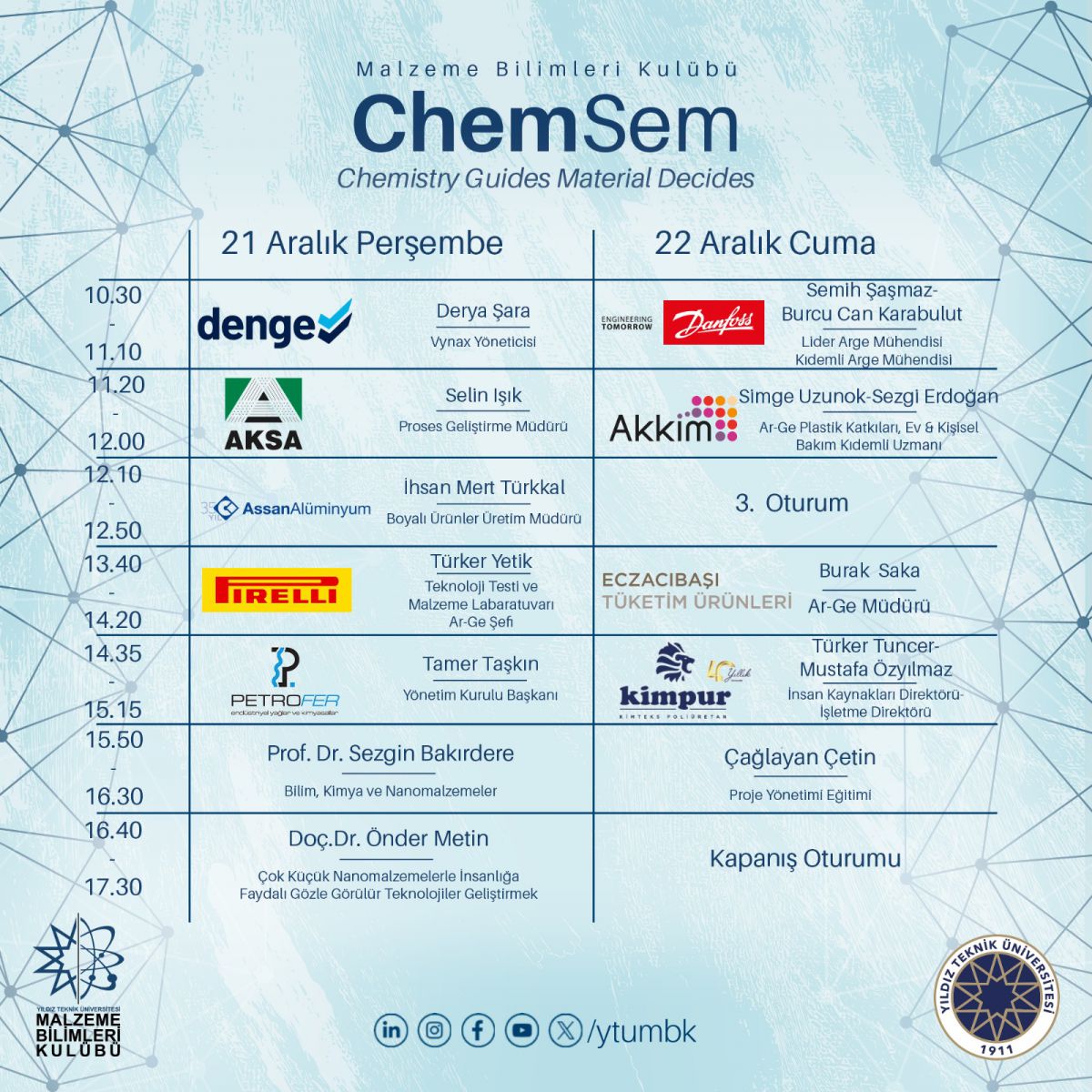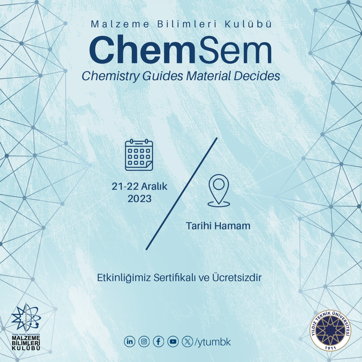 21-22 Aralık 2023 tarihlerinde YTÜ MBK ChemSem'23 Etkinliği gerçekleştirilecektir. İlgili broşürler aşağıda sunulmuştur.