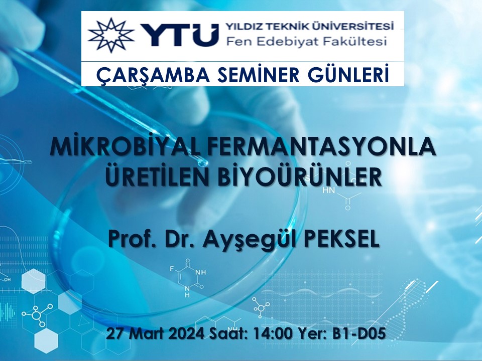 2023-2024 Bahar dönemi Fen-Edebiyat Fakültesi Çarşamba Seminer Günleri'ne Prof. Dr. Ayşegül PEKSEL hocamızın "Mikrobiyal Fermantasyonla Üretilen Biyoürünler" isimli semineri ile devam ediyoruz.