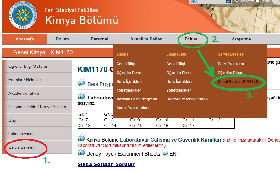 2. üst menü "Eğitim" kısmını tıklayınız, sonra 3. açılan menüden "Genel Kimya - KIM1170" tıklayınız.