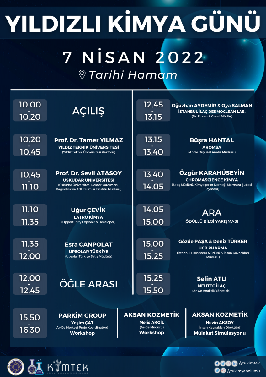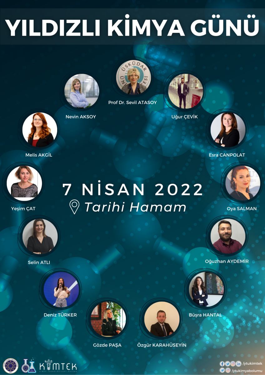 Bildiğiniz üzere 7 Nisan Kimya Günü olarak kutlanmaktadır. Bu nedenle 7 Nisan 2022 perşembe günü YTÜ Tarihi Hamam da düzenlemiş olduğumuz etkinliğimize sizleri davet etmekten ve bu özel günde hep birlikte kutlamaktan mutluluk duyarız. Süprizlerle dolu etkinlik için ayrıntılı bilgiyi Kimya Bölümü ve Kimtek kulübü sosyal medya hesaplarından edinebilirsiniz. 7 Nisan da görüşmek dileği ile.
