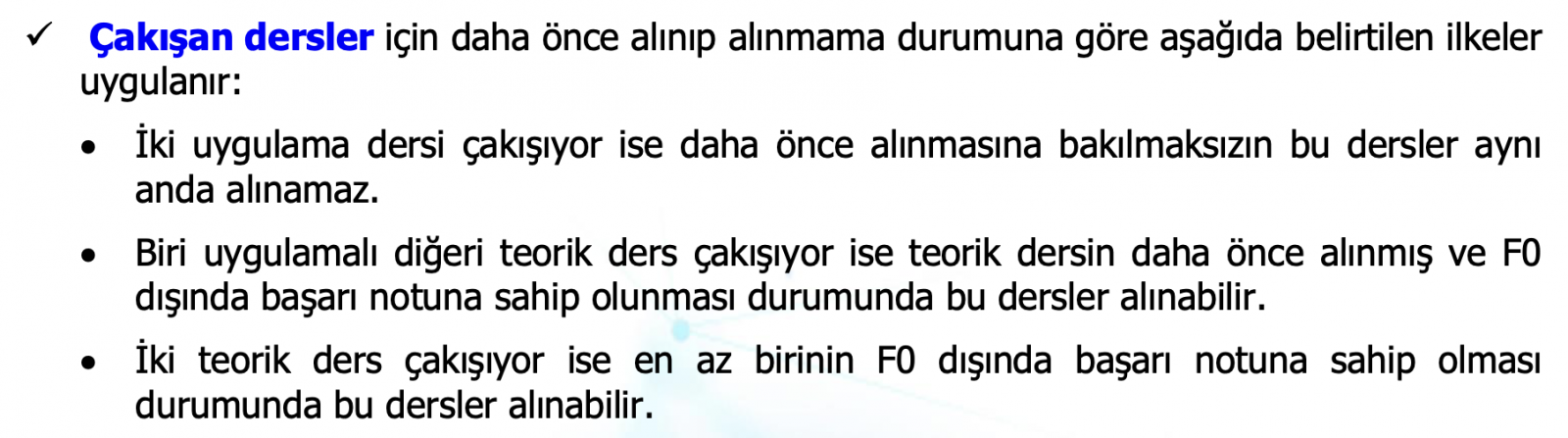 ÖNEMLİ NOT 2: Derslerinizin çakışması durumunda ilk defa alacağınız dersi seçip çakışan (F0 harici notla kalınmış olmalı) diğer kaldığınız ders için çakışma dilekçesi vermeniz gerekmektedir. Çakışan fakat ilk defa alacağınız ders için dilekçe verdiğinizde işleme alınmayacaktır. ÇAKIŞAN DERSLER KREDİ SINIRINA GÖRE EKLENMEKTEDİR. ÇAKIŞAN DERSLERİNİZ OLSA BİLE MAKSİMUM 25 KREDİYE KADAR EKLENEBİLİR. 3.00 VE ÜSTÜ ORTALAMA İÇİN 28 KREDİ, ÇAP, YANDAL VE FORMASYON İÇİN 31 KREDİYE KADARDIR.