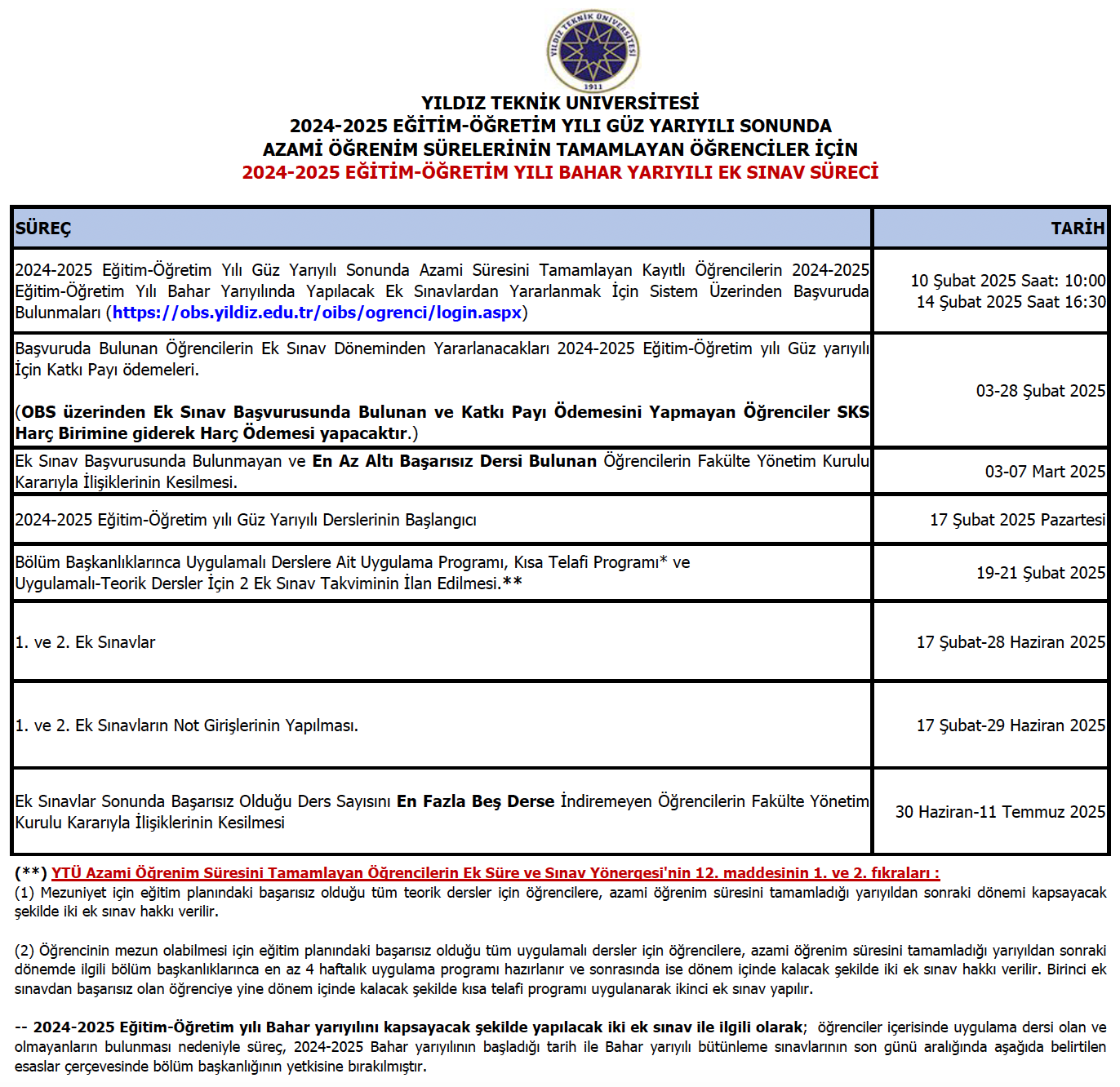 Azami ek sınavlar ile ilgili takvim aşağıda belirtilmiştir. 1. Sınavlar Final sınav tarihlerinde 2. sınavlar ise bütünleme sınav tarihlerinde yapılacak olup net tarihler ilerleyen haftalarda ilan edilecektir.