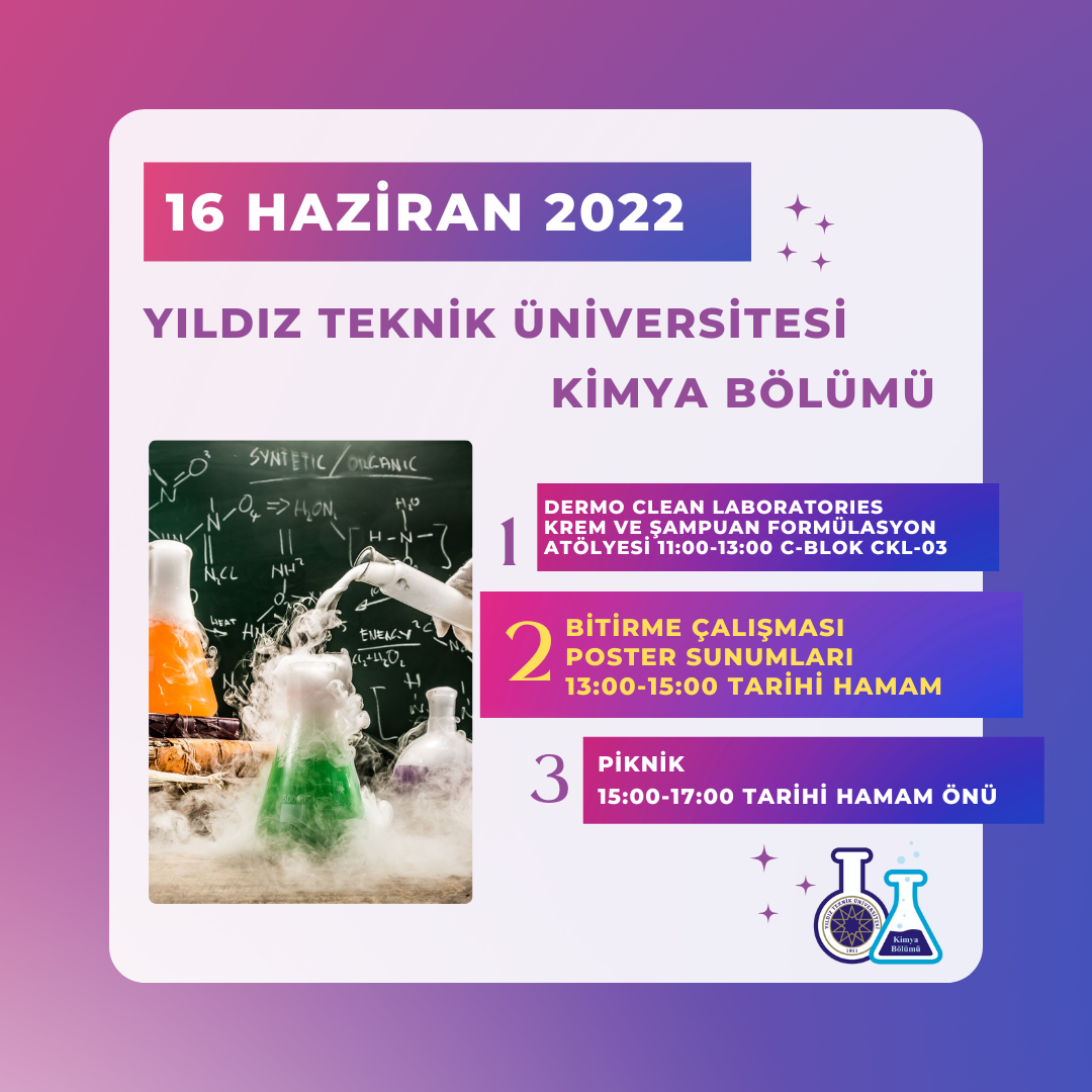 16.06.2022 tarihinde saat: 11:00-13:00 saatleri arasında C-Blok CKL-03 nolu laboratuvarda Dermo Clean firması tarafından Krem ve Şampuan formülasyon atölyesi düzenlenecektir. Katılım için başvuru yapan öğrencilerimizin, öğrenci email adreslerine bildirim yapılmış olup, öğrencilerimizin atölyeye gelirken hazırladıkları formülasyonu saklamaları için kap getirmesi önemle rica olunur.